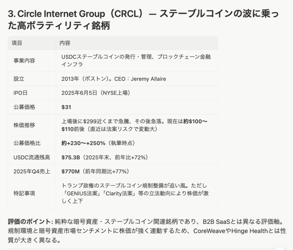 2025年は「IPO復活の年」と喧伝されたが、実態はほぼ惨敗だった。上場した「主要B2B13社」のうち、公募価格を上回っているのはわずか3社(CoreWeave・Hinge Health・Circle)のみ。残りの大多数は大幅に下落しており、Klarnaに至っては公募価格比▲69%に沈んでいる。市場が評価するのはAIインフラそのものだけであり、「AI活用企業」や「AI企業」を標榜するだけでは投資家に響かない。また、上場初日の急騰はほぼ例外なく剥落しており、機関投資家の素早い売り抜けが常態化している。堅調な売上成長だけでは高バリュエーションを正当化できない時代となり、GAAP黒字化またはAIへの本質的な関与が不可欠な条件となっている。