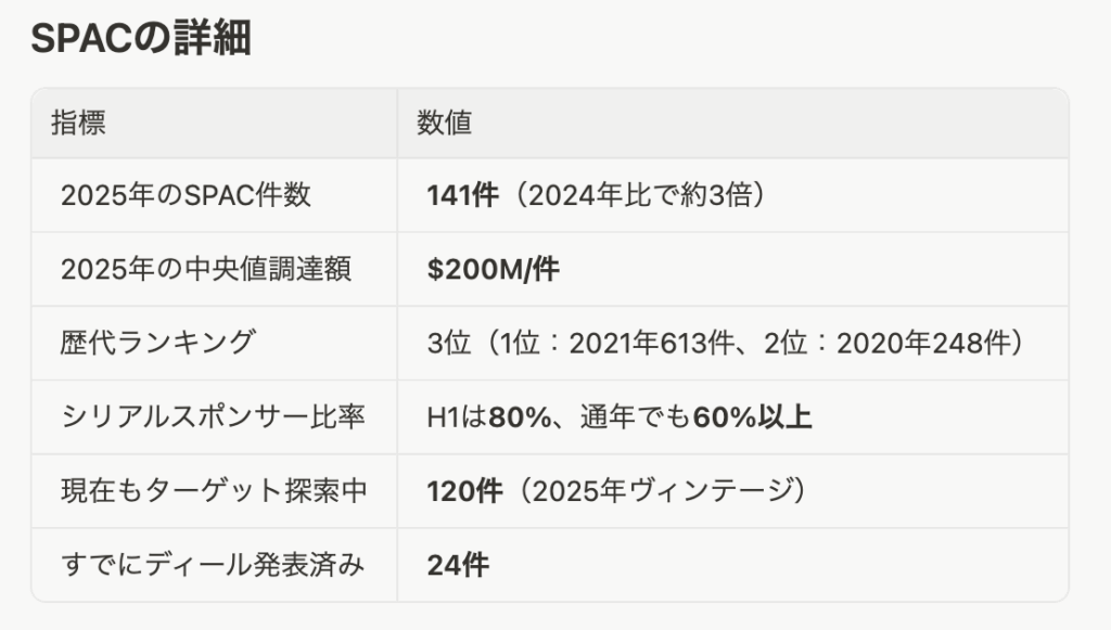 SPACは上場後に合併先企業を2年以内に探す仕組みであり、上場時点では空箱だ。2021年のSPACブームでは最終的に50%が清算(投資家に資金返還)されており、2025年ヴィンテージも同様のリスクを抱えている。