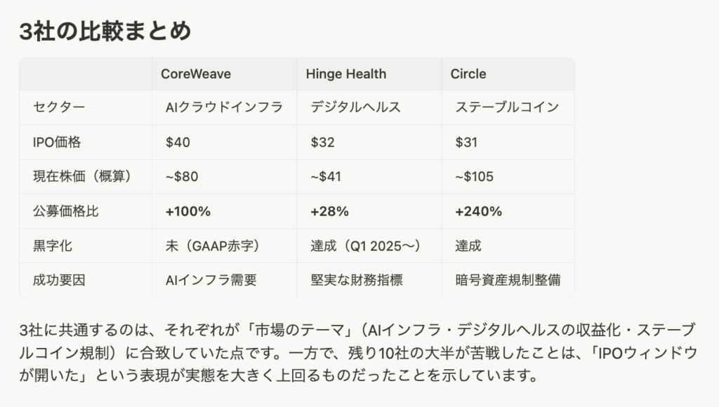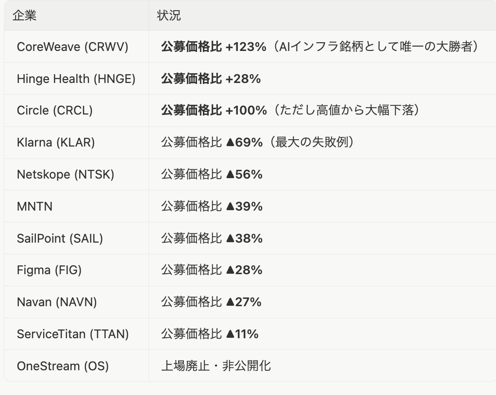 2025年のIPO347件という総数の41%(141件)はSPACであり、合併先が決まっていない「空箱」だ。 残りの従来型IPO206件の中でも、小型案件($50M未満)は年末時点でほぼ全滅に近い状況である。大型・高品質な案件に限れば+21%のリターン」という事実が、いかに選別が重要かを示している。SaaStr記事が「13社中3社しか公募価格を上回っていない」と指摘した対象は、この中でも特に注目度の高い大型テック・B2B SaaS案件に絞ったものであり、市場全体の厳しさをより鮮明に映し出している。