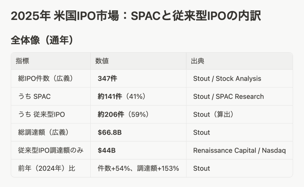 上記表のとおり、2025年通期のIPO: 347社の内訳を見ると、従来型IPO約6割SPAC約4割となっている。下記の表はその詳細である。