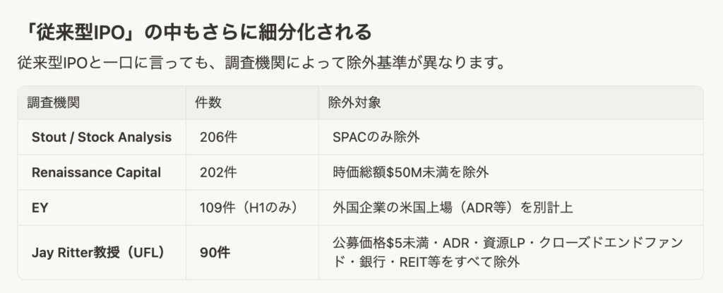 Ritter教授の90件が最も厳格な「純粋な事業会社のIPO」の定義であり、学術的に最も引用される数字である。
